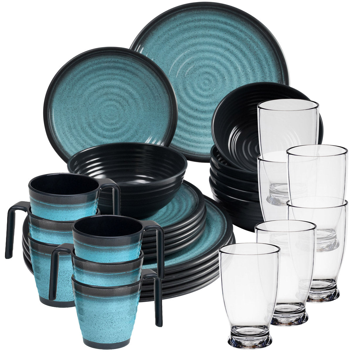 Melamin Geschirr Set 30 Teile elegante Steingut Optik in blau mit Tassen Wasserglas 380ml klar - für 6 Personen Essgeschirr Gläser Wasserglas Tumbler Whiskey Campinggeschirr Picknick Camping Outdoor