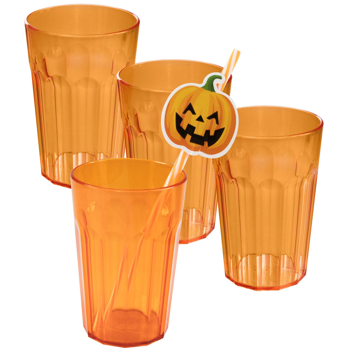 4 Stück Halloween Party-Trinkglas ORANGE 630 ml Trinkgläser - für 4 Personen - bruchfest Party Tischdeko Glas Set - Kunststoff Party Picknick Kinder Wasserglas