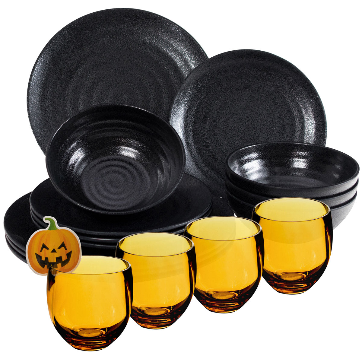 Halloween Geschirrset aus Melamin für 4 Personen - 16 Teile - schwarz - mit orangen Trinkgläsern - Partygedeck Partygeschirr Party Tischdeko