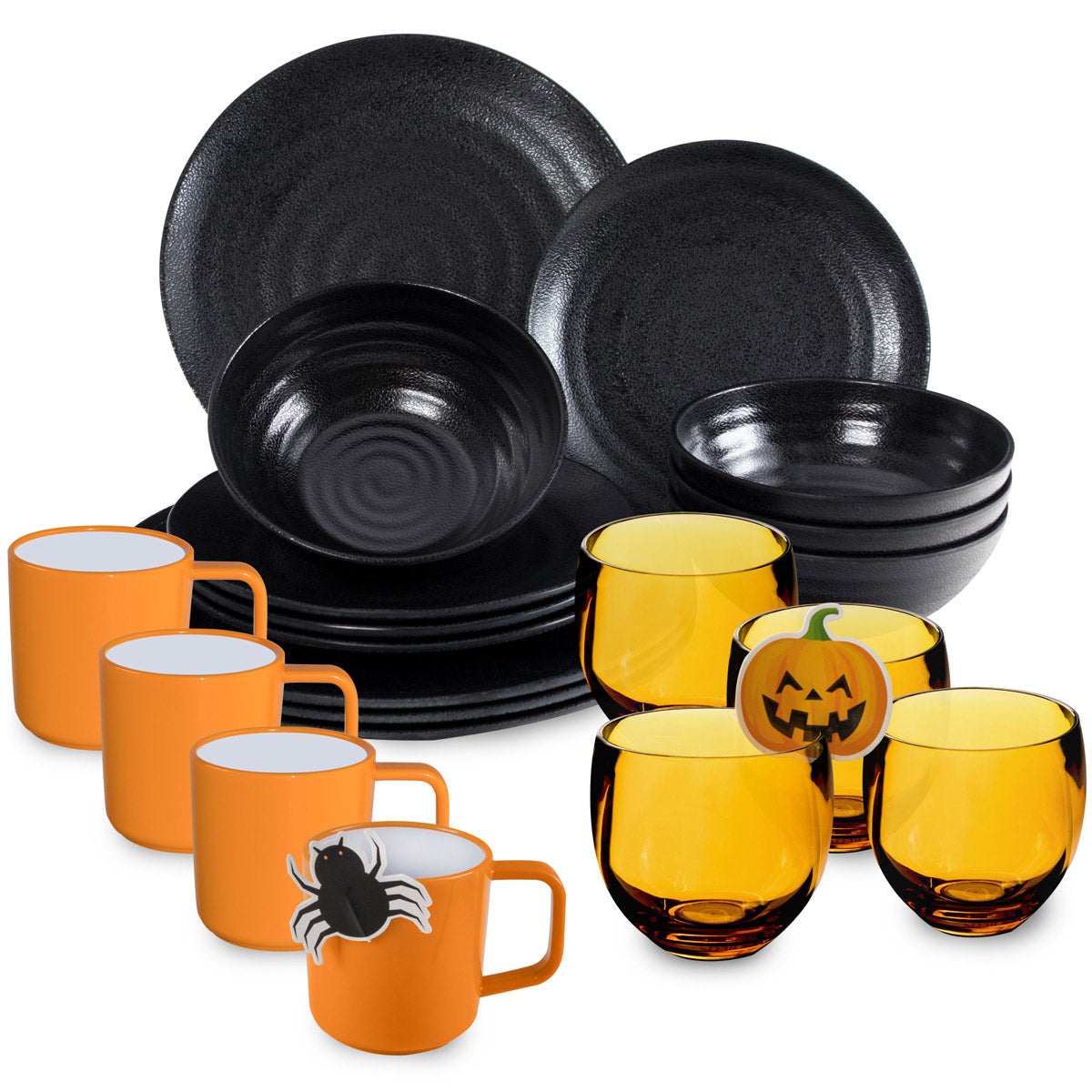 Halloween Geschirrset aus Melamin für 4 Personen - 20 Teile - schwarz - mit orangen Trinkgläsern - Partygedeck Partygeschirr Party Tischdeko