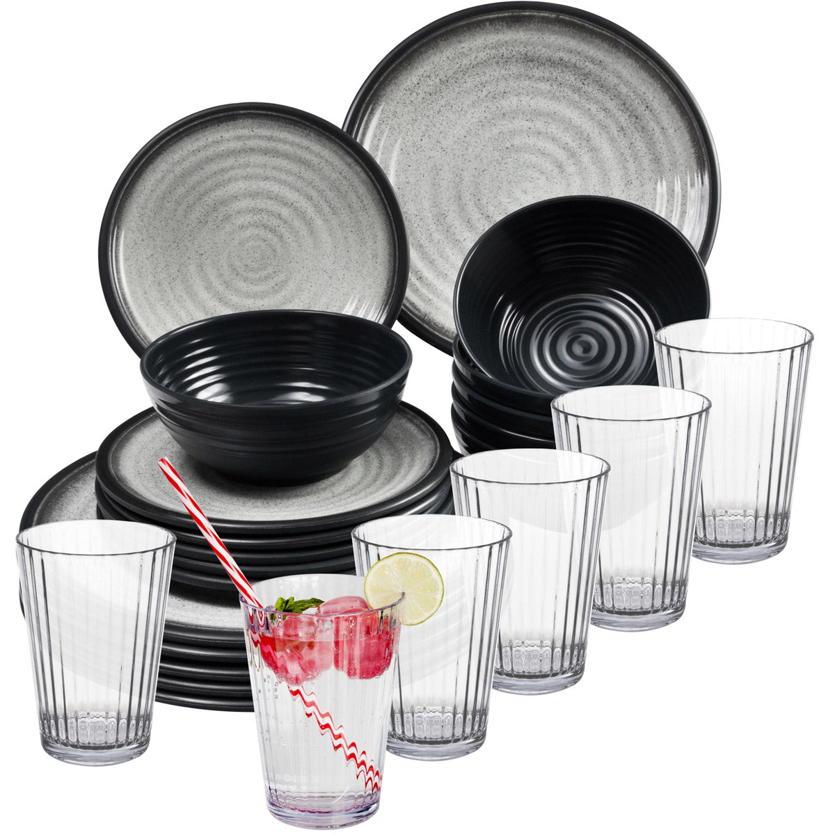 Melamin Geschirr Set für 6 Personen Grau Granit-Optik 24 Teile - mit klaren Trinkgläsern 580 ml - Campinggeschirr Geschirrset Tafelgeschirr - Spülmaschinengeeignet Tableware Outdoor Camping