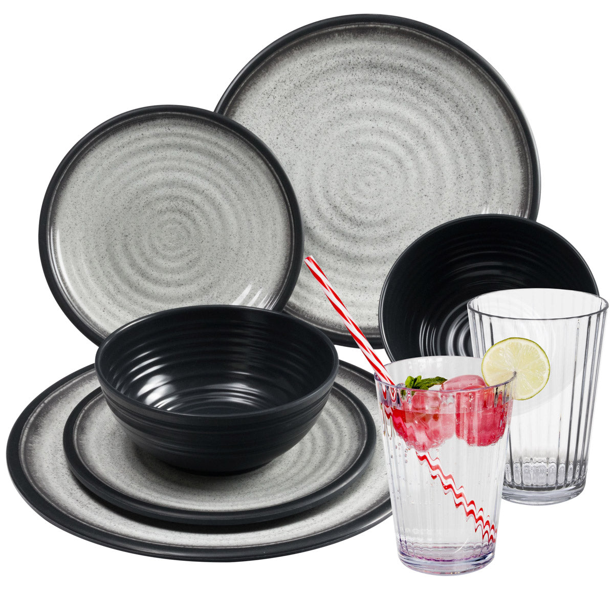 Melamin Geschirr Set für 2 Personen Grau Granit-Optik 8 Teile - mit klaren Trinkgläsern 580 ml - Campinggeschirr Geschirrset Tafelgeschirr - Spülmaschinengeeignet Tableware Outdoor Camping