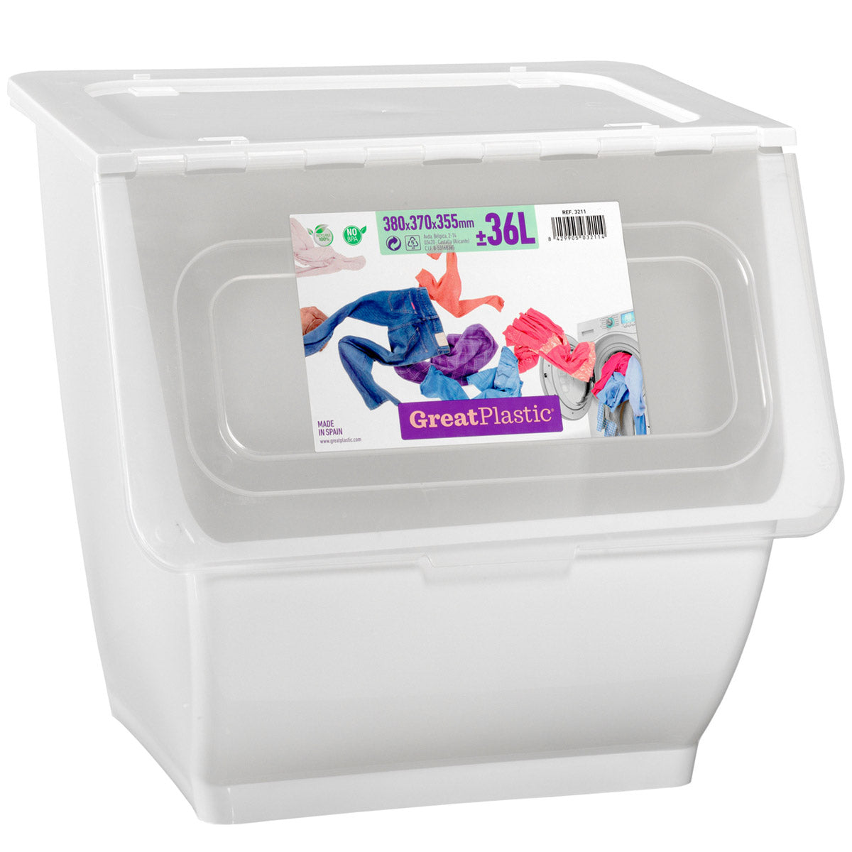 Stapelbarer Müllsortierer 36 Liter Weiss Wäschesortierer Aufbewahrungsbox mit transparentem Frontdeckel faltbarer Deckel Stapelkiste