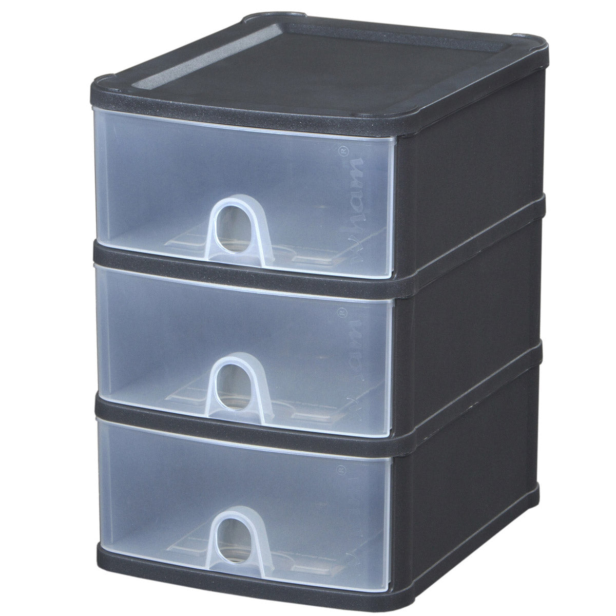 Schubladenbox DIN A5 mit 3 Schubladen 25x20x29 cm - schwarz-transparent Kunststoff Drawer Tower Box Organizer für Schreibtisch Easy-Pull-System