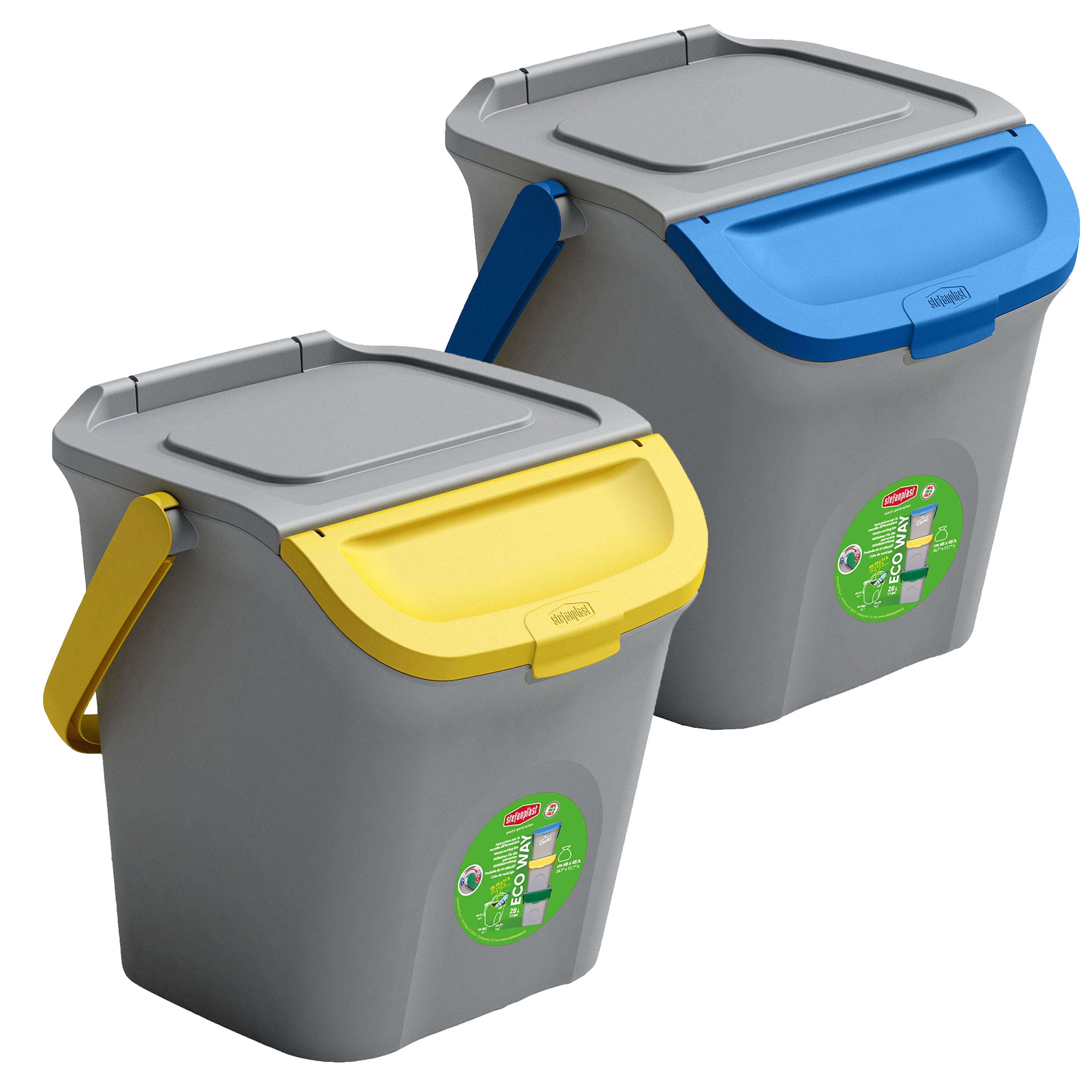 2x Stapelbarer Müllsortierer 28 Liter Grau mit FARBIGEM Faltdeckel 39x37x41 cm Mülleimer Mülltonne Mülltrennsystem Recyclingtonne verschließbarer Deckel