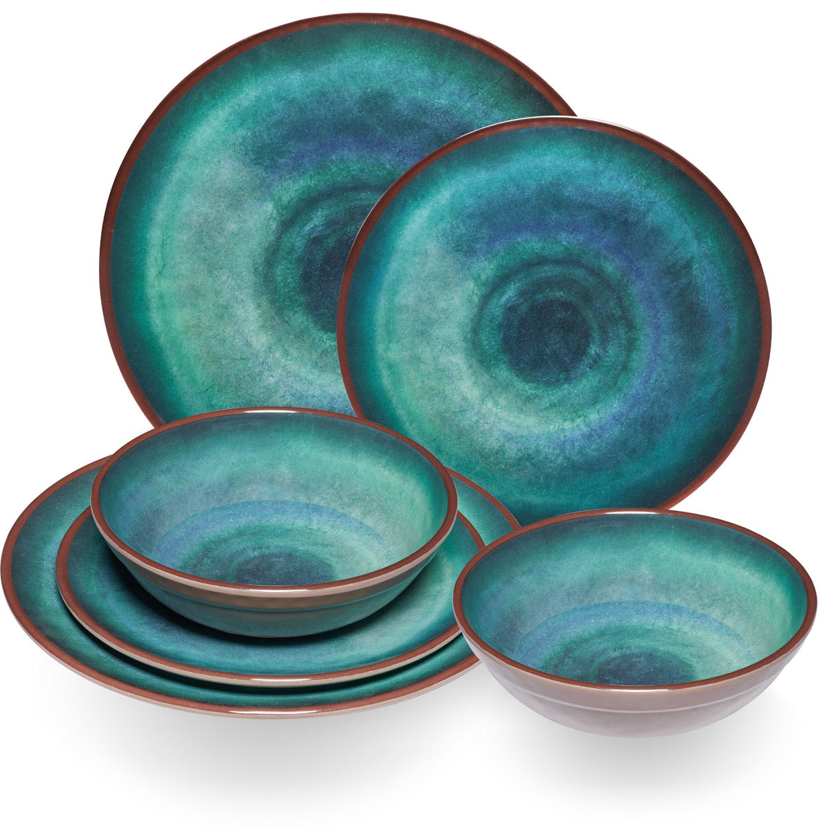 MELAMIN GESCHIRRSET 6 TEILE FÜR 2 PERSONEN: Jesolo Grün - Steingut-Optik in Grüntönen mit Terracotta - Oberfläche uneben und wellig - ideal für Camping, Outdoor, Picknick oder Festival 6 TEILE:...
