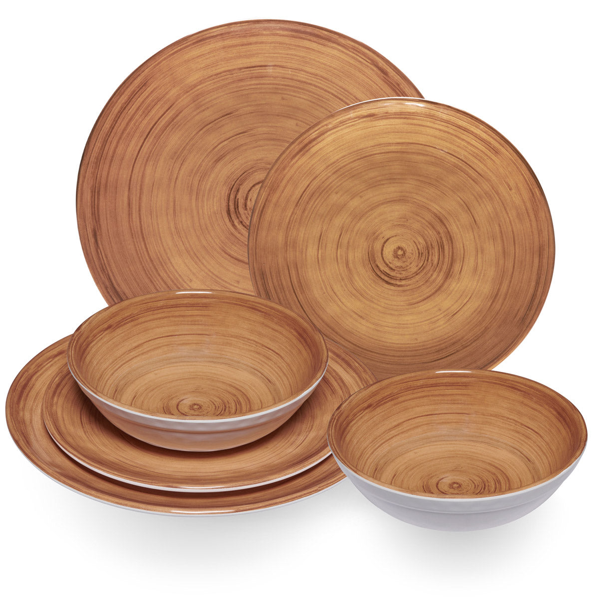 MELAMIN GESCHIRRSET 6 TEILE FÜR 2 PERSONEN: Bambi Braun - Holz-Optik in Brauntönen auf weißem Grundmaterial - Oberfläche uneben und wellig - ideal für Camping, Outdoor, Picknick oder Festival 6 TEILE:...