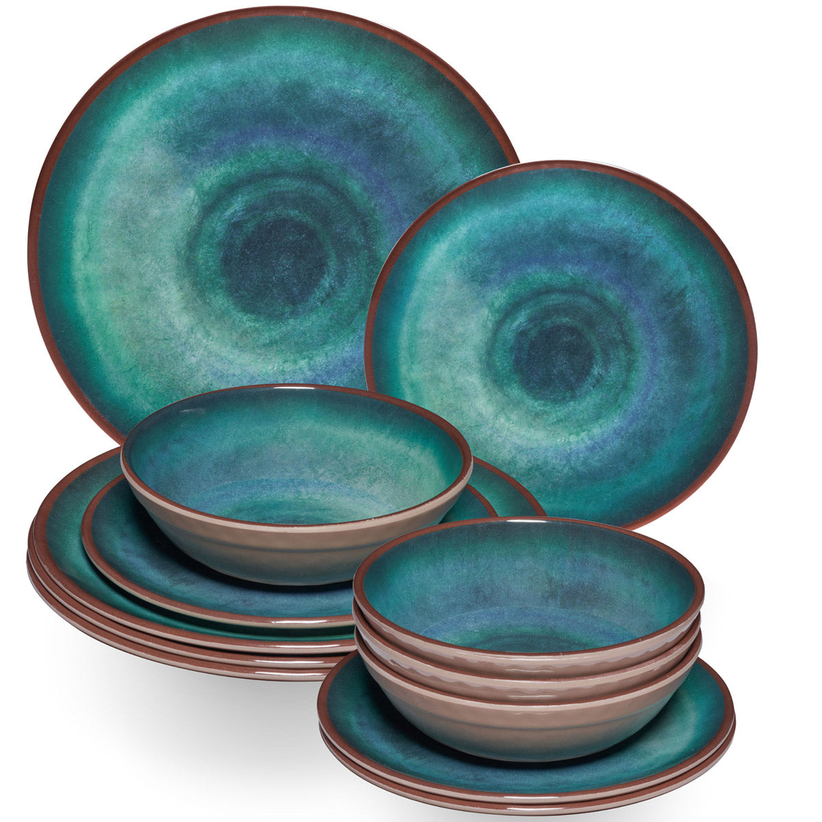 MELAMIN GESCHIRRSET 12 TEILE FÜR 4 PERSONEN: Jesolo Grün - Steingut-Optik in Grüntönen mit Terracotta - Oberfläche uneben und wellig - ideal für Camping, Outdoor, Picknick oder Festival 12 TEILE:...