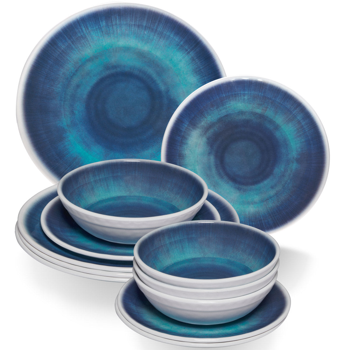 MELAMIN GESCHIRRSET BLAU 12 TEILE FÜR 4 PERSONEN: Jesolo Blau - Steingut-Optik in Blautönen auf weißem Grundmaterial - Oberfläche uneben und wellig - ideal für Camping, Outdoor, Picknick oder Festival...