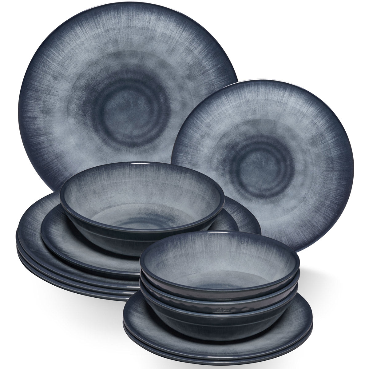 MELAMIN GESCHIRRSET 12 TEILE FÜR 4 PERSONEN: Jesolo Grau - Steingut-Optik in Grautönen auf schwarzem Grundmaterial - Oberfläche uneben und wellig - ideal für Camping, Outdoor, Picknick oder Festival 12...