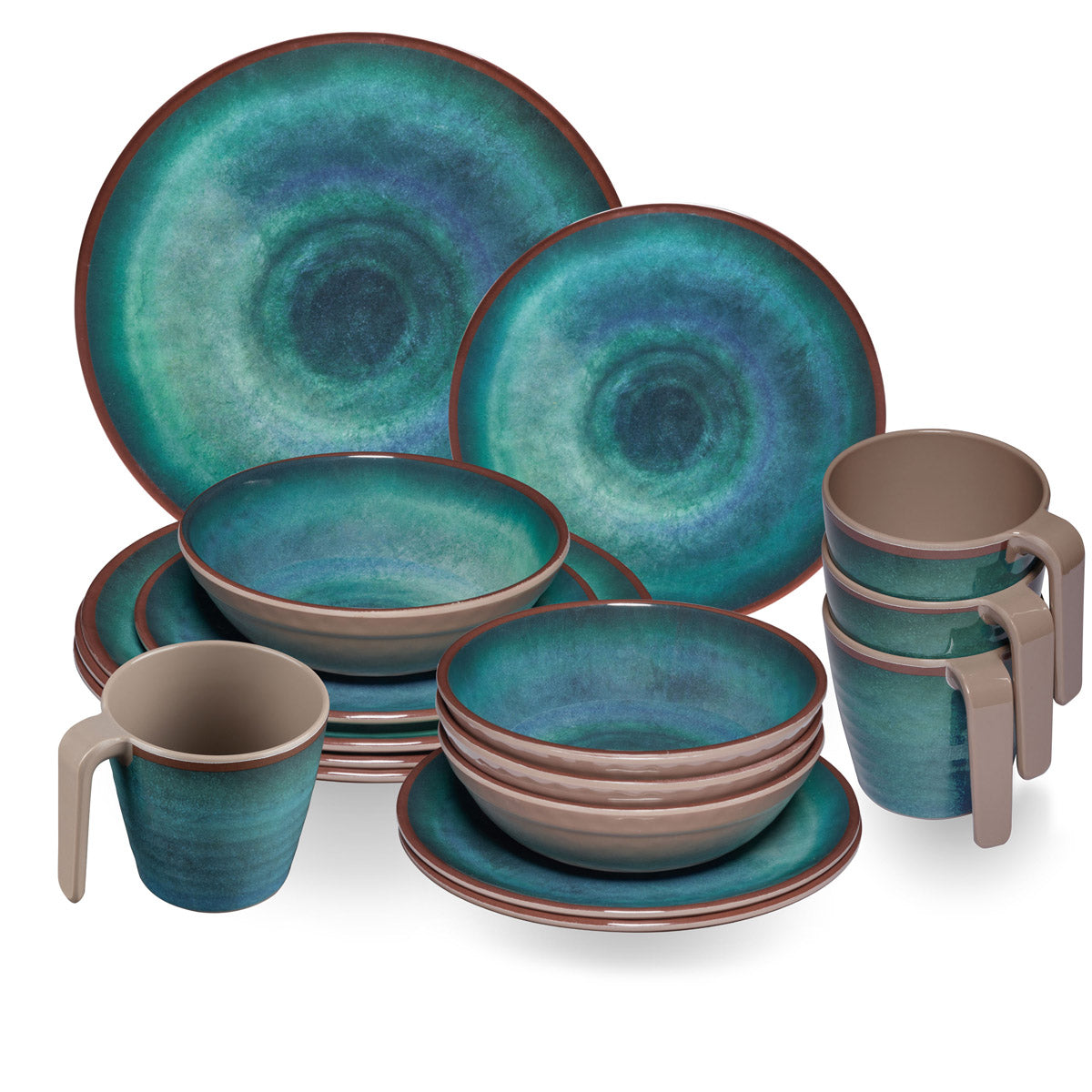 Melamin Geschirr Set Jesolo Grün für 4 Personen - 16 Teile - mit Tassen Steingutoptik Spülmaschinengeeignet Campinggeschirr Wohnwagen Camping Festival