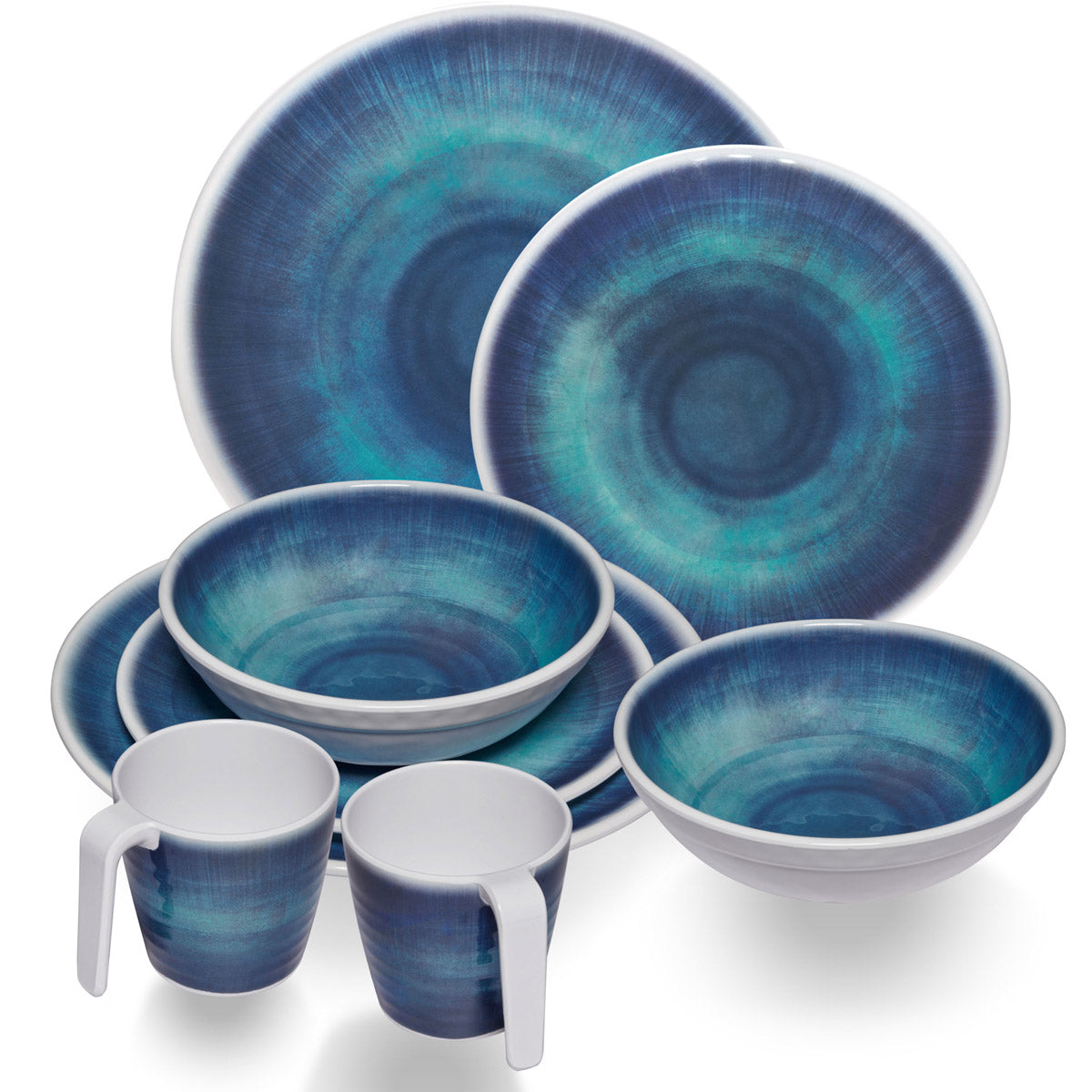 Melamin Geschirr Set Jesolo Blau für 2 Personen - 8 Teile - mit Tassen Steingutoptik Campinggeschirr
