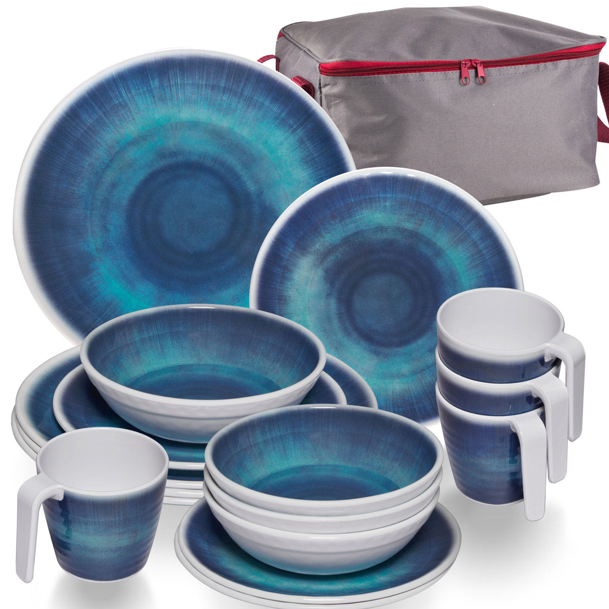 Melamin Geschirr Set Jesolo Blau für 4 Personen - 17 Teile - mit Tassen und Aufbewahrungstasche Steingutoptik Campinggeschirr