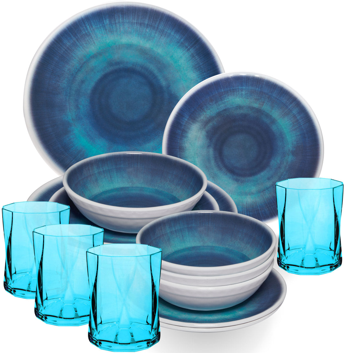 Melamin Geschirr Set Jesolo Blau für 4 Personen - 16 Teile - mit farblich passenden Trinkgläsern 300ml aus Acryl Campinggeschirr
