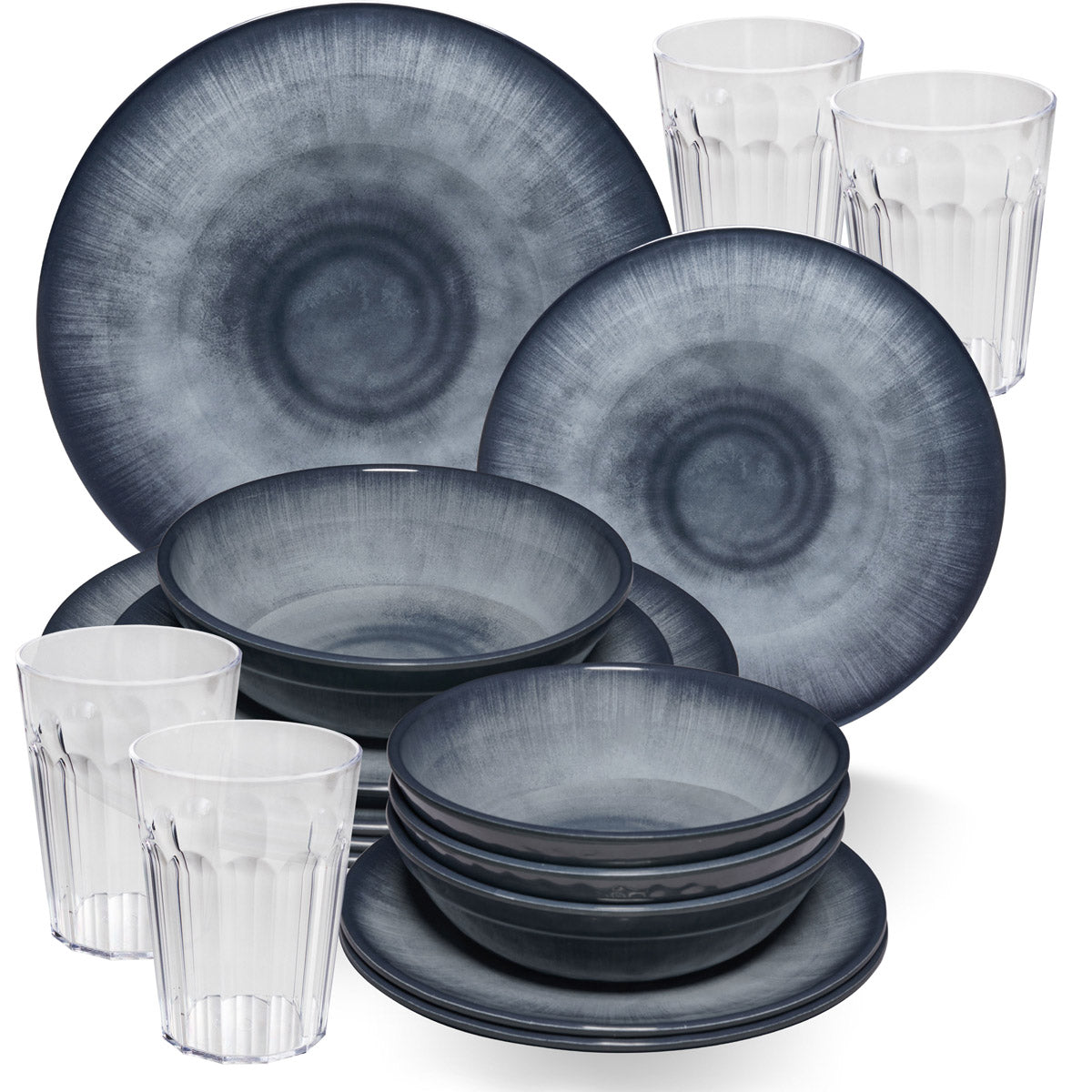 Melamin Geschirr Set Jesolo Grau für 4 Personen - 16 Teile - mit Trinkglas 450 ml klar Steingutoptik - Campinggeschirr