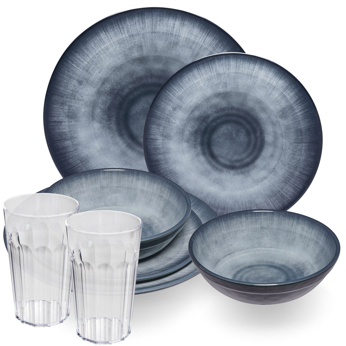 Melamin Geschirr Set Jesolo Grau für 2 Personen - 8 Teile - mit Trinkglas 630 ml klar Steingutoptik - Campinggeschirr Camping