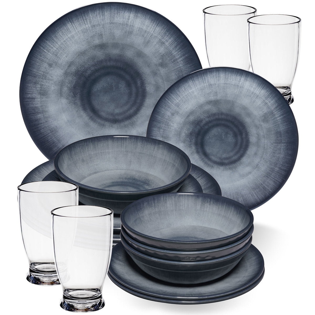 Melamin Geschirr Set Jesolo Grau für 4 Personen - 16 Teile - mit klarem Trinkglas 380ml - aus Acryl Steingutoptik Campinggeschirr