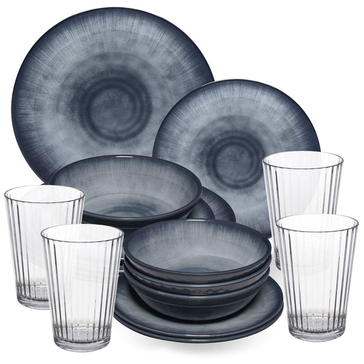 Melamin Geschirr Set Jesolo Grau für 4 Personen - 16 Teile - mit klarem Trinkglas 580ml - aus Acryl Steingutoptik Campinggeschirr
