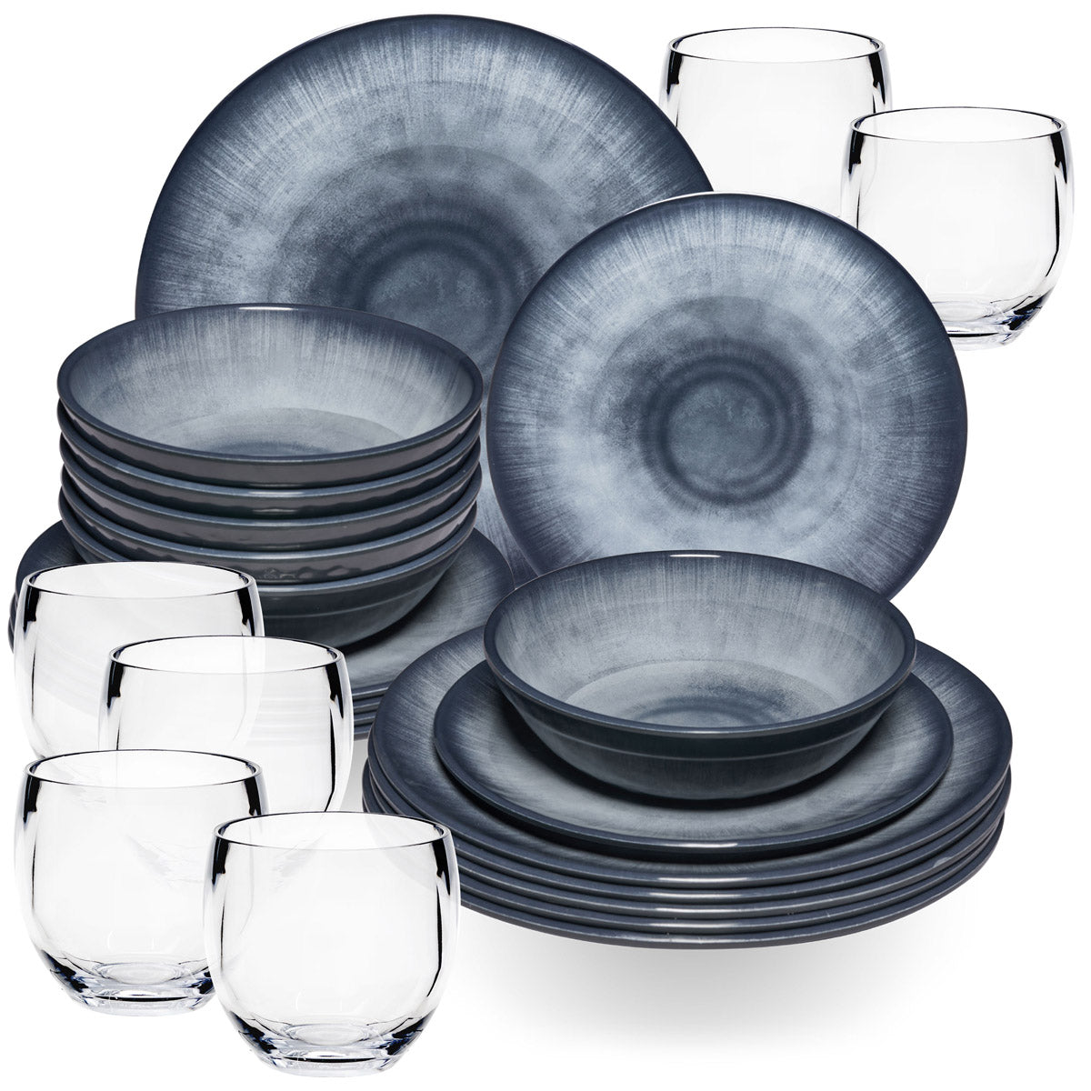 Melamin Geschirr Set Jesolo Grau für 6 Personen - 24 Teile - mit klarem Trinkglas 400ml - aus Acryl Steingutoptik Spülmaschinengeeignet Campingzubehör Campinggeschirr Wohnwagen Camping Festival