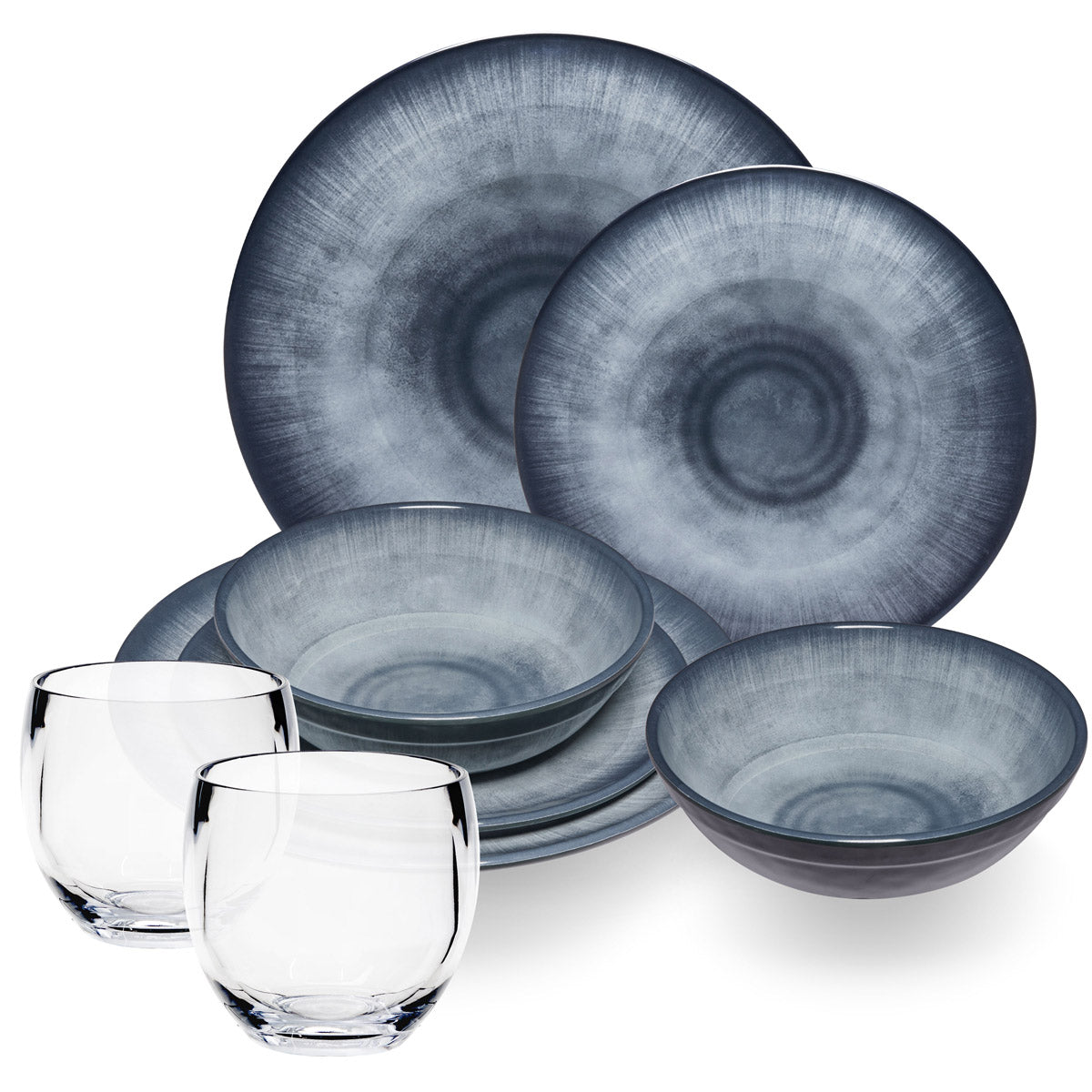 MELAMIN GESCHIRRSET 8 TEILE FÜR 2 PERSONEN MIT KLAREN TRINKGLÄSERN AUS ACRYL 400ML: Jesolo Grau - Steingut-Optik in Grautönen auf schwarzem Grundmaterial - klare Trinkgläser - Oberfläche uneben und wellig -...
