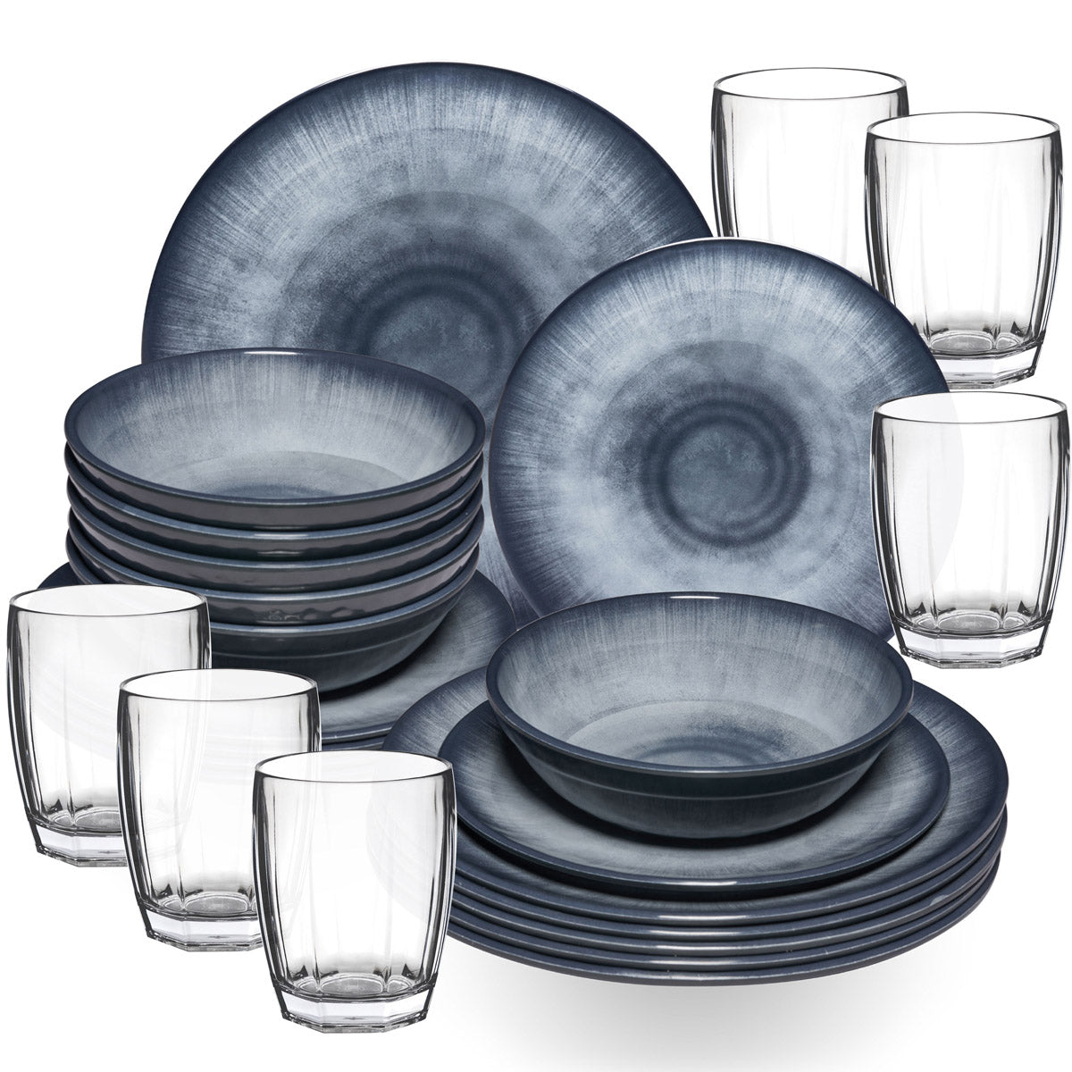 Melamin Geschirr Set Jesolo Grau für 6 Personen - 24 Teile - mit klarem Trinkglas 320ml - aus Acryl Steingutoptik Spülmaschinengeeignet Campingzubehör Campinggeschirr Wohnwagen Camping Festival