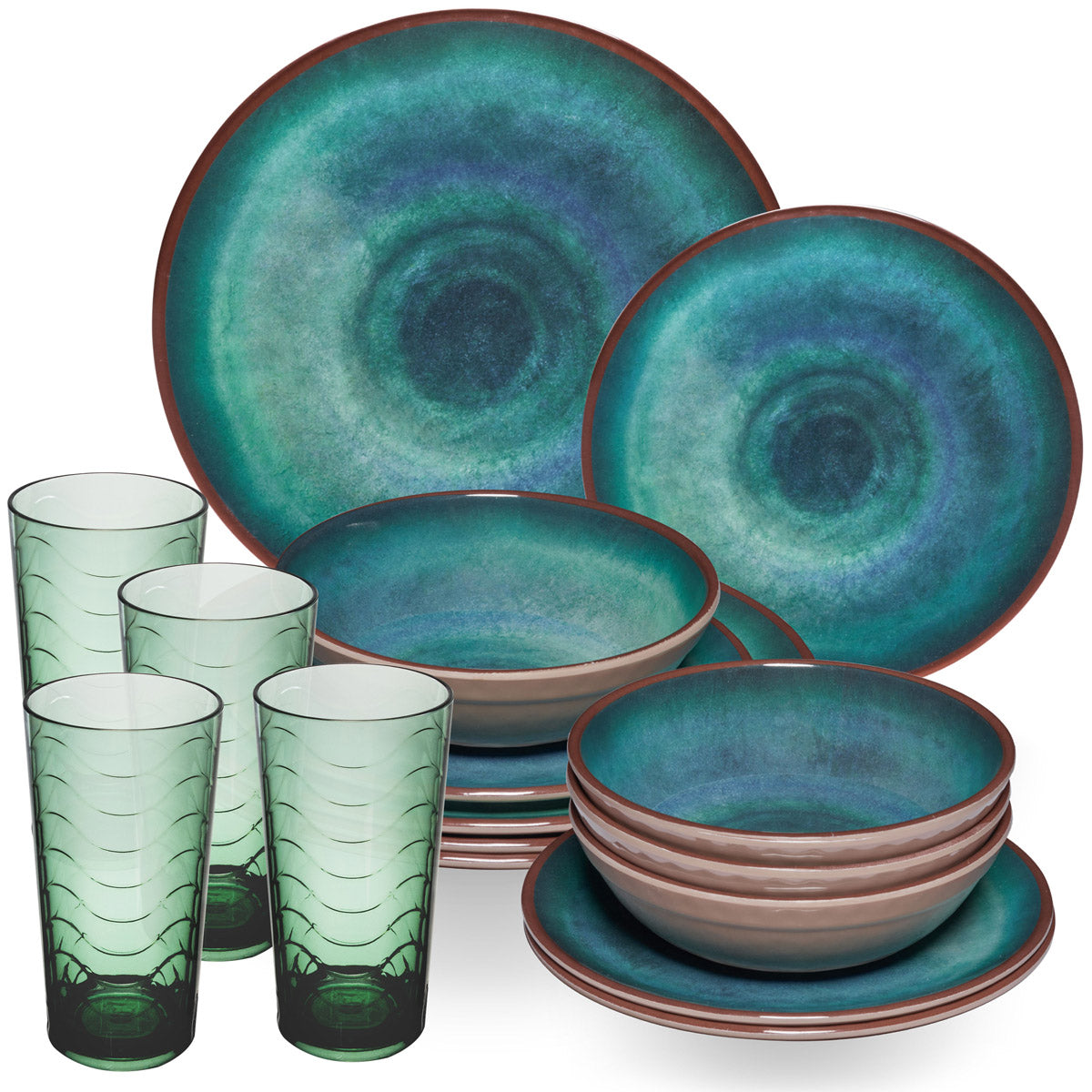 MELAMIN GESCHIRRSET 16 TEILE FÜR 4 PERSONEN MIT GRÜNEN ACRYL TRINKGLÄSERN 260ML: Jesolo Grün - Steingut-Optik in Grüntönen auf Terracotta Grundmaterial - grüne Acryl Trinkgläser - Oberfläche uneben und wellig...