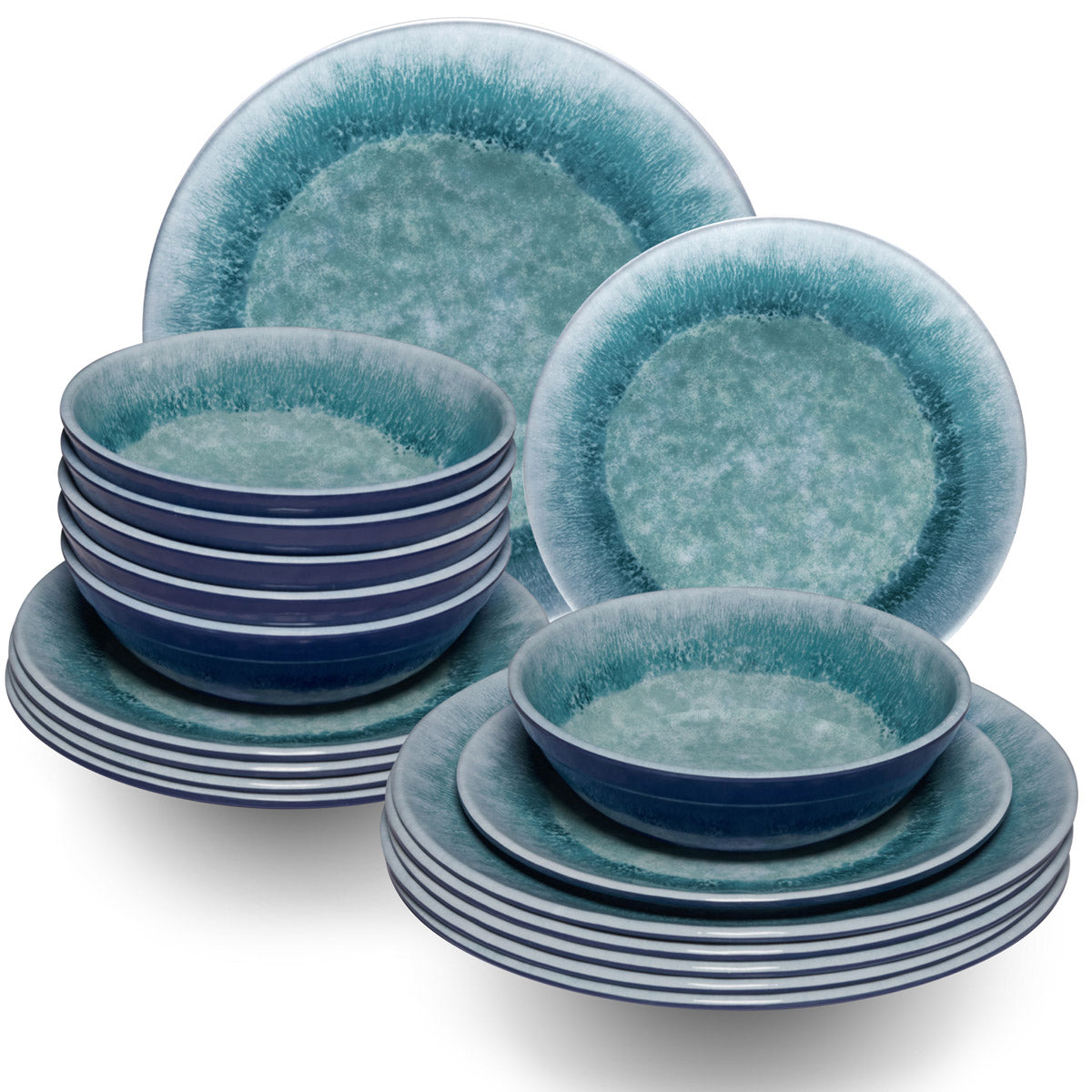 Melamin Geschirr Set Adria Blue für 6 Personen - 18 Teile Blau - Steingutoptik Essgeschirr Campinggeschirr