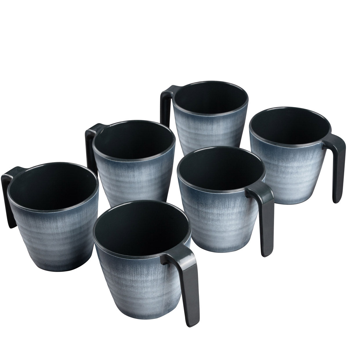 MELAMIN TASSEN FÜR 6 PERSONEN JESOLO GRAU: Jesolo Grau - Steingut-Optik in Grautönen auf schwarzem Grundmaterial - offener Henkel - ideal zum Stapeln Oberfläche uneben und wellig - ideal für Camping,...