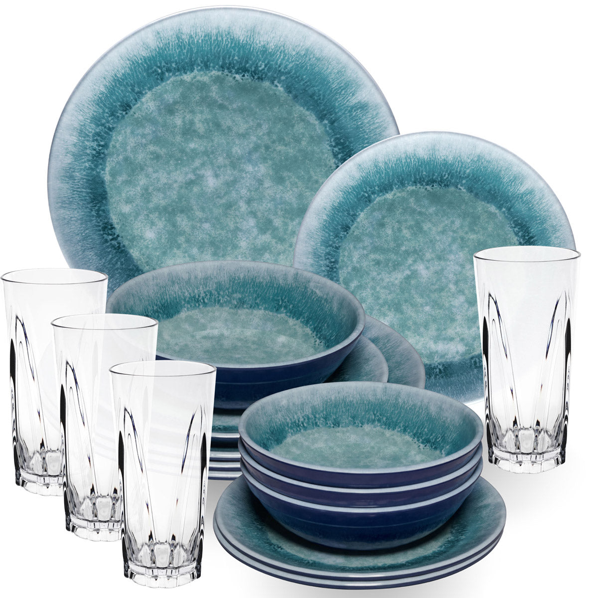 Melamin Geschirr Set Adria Blue für 4 Personen - 16 Teile Blau - mit klarem Trinkglas 450ml aus Acryl Steingutoptikgeschirr