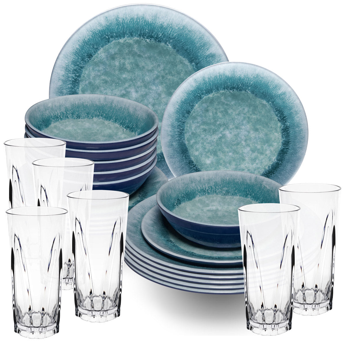 MELAMIN GESCHIRRSET 24 TEILE FÜR 6 PERSONEN MIT KLAREN TRINKGLÄSERN AUS ACRYL 450ML:  Adria Blue - Steingut-Optik in Türkistönen auf blauem Grundmaterial - Oberfläche uneben und wellig - ideal für Camping,...