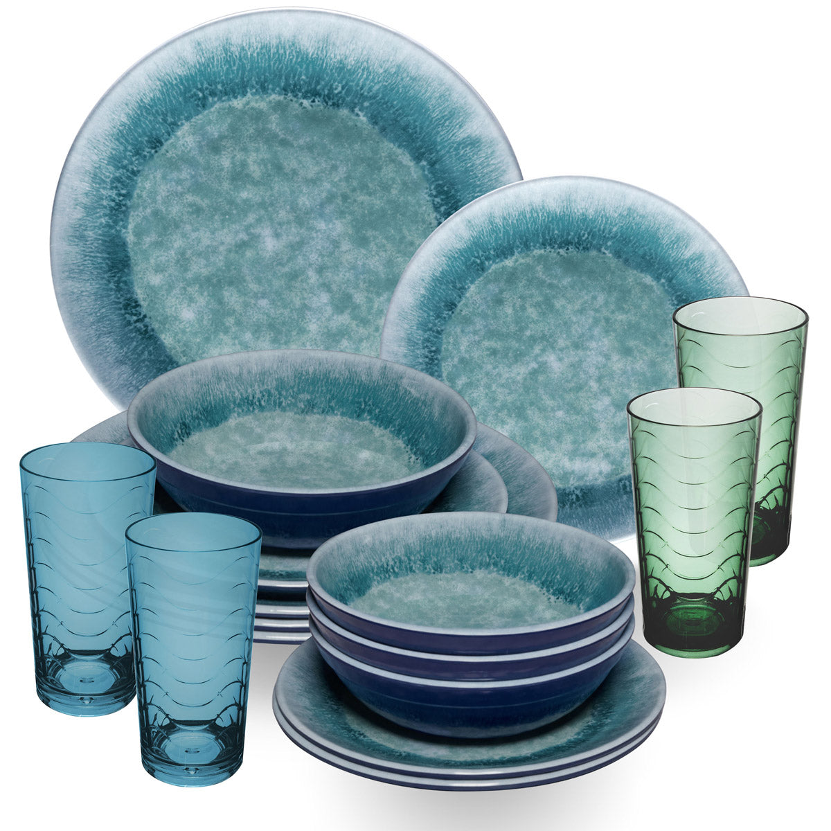 MELAMIN GESCHIRRSET 16 TEILE FÜR 4 PERSONEN MIT ACRYL TRINKGLÄSERN 260ML IN GRÜN BLAU:  Adria Blue - Steingut-Optik in Türkistönen auf blauem Grundmaterial - Oberfläche uneben und wellig - ideal für Camping,...