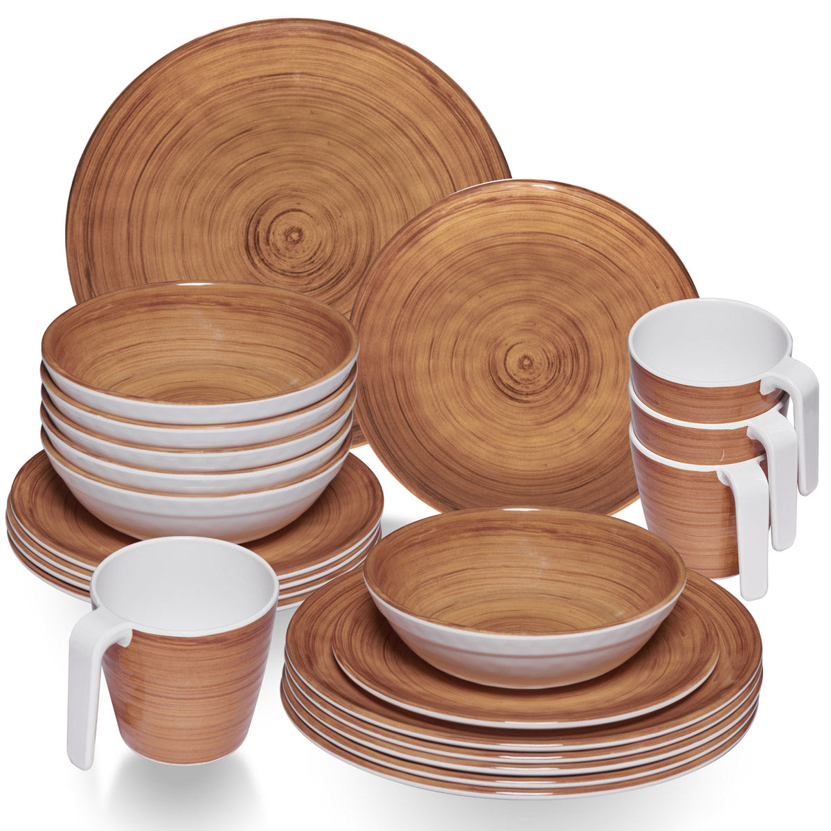 MELAMIN GESCHIRRSET 24 TEILE FÜR 6 PERSONEN MIT TASSEN: Bambi Braun - Holz-Optik in Brauntönen auf weißem Grundmaterial - Oberfläche uneben und wellig - ideal für Camping, Outdoor, Picknick oder Festival...