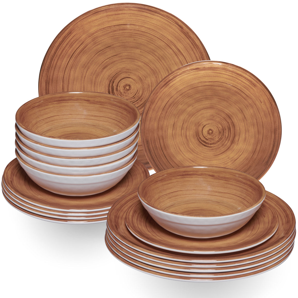 MELAMIN GESCHIRRSET 18 TEILE FÜR 6 PERSONEN: Bambi Braun - Holz-Optik in Brauntönen auf weißem Grundmaterial - Oberfläche uneben und wellig - ideal für Camping, Outdoor, Picknick oder Festival 18 TEILE:...