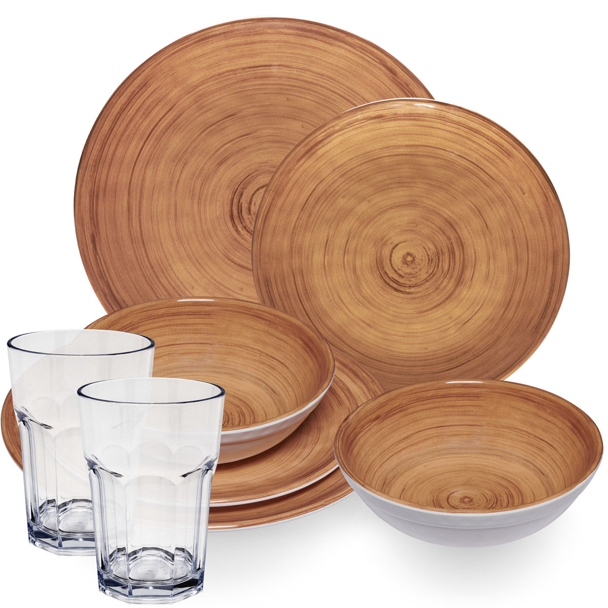 Melamin Geschirr Set Bambi Braun für 2 Personen - 8 Teile mit klaren Trinkgläsern 400 ml aus Acryl Steingutoptik Campinggeschirr