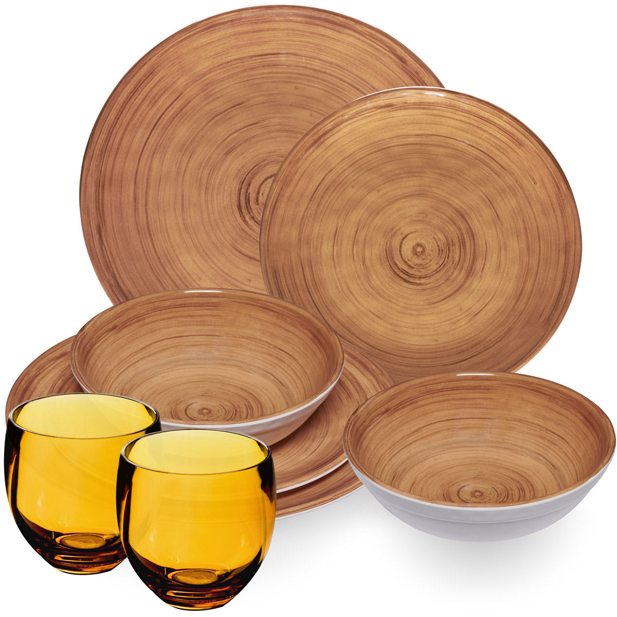 Melamin Geschirr Set Bambi Braun für 2 Personen - 8 Teile mit farblich passenden Trinkgläsern 400 ml Acryl Steingutoptik Campinggeschirr
