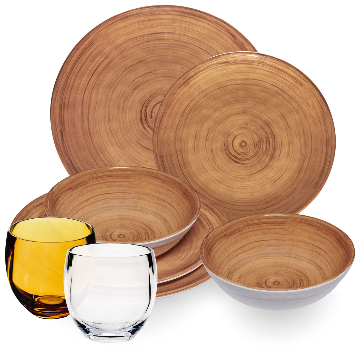 MELAMIN GESCHIRRSET 8 TEILE FÜR 2 PERSONEN MIT ACRYL TRINKGLÄSERN 400ML IN KLAR GOLD: Bambi Braun - Holz-Optik in Brauntönen auf weißem Grundmaterial - Oberfläche uneben und wellig - ideal für...