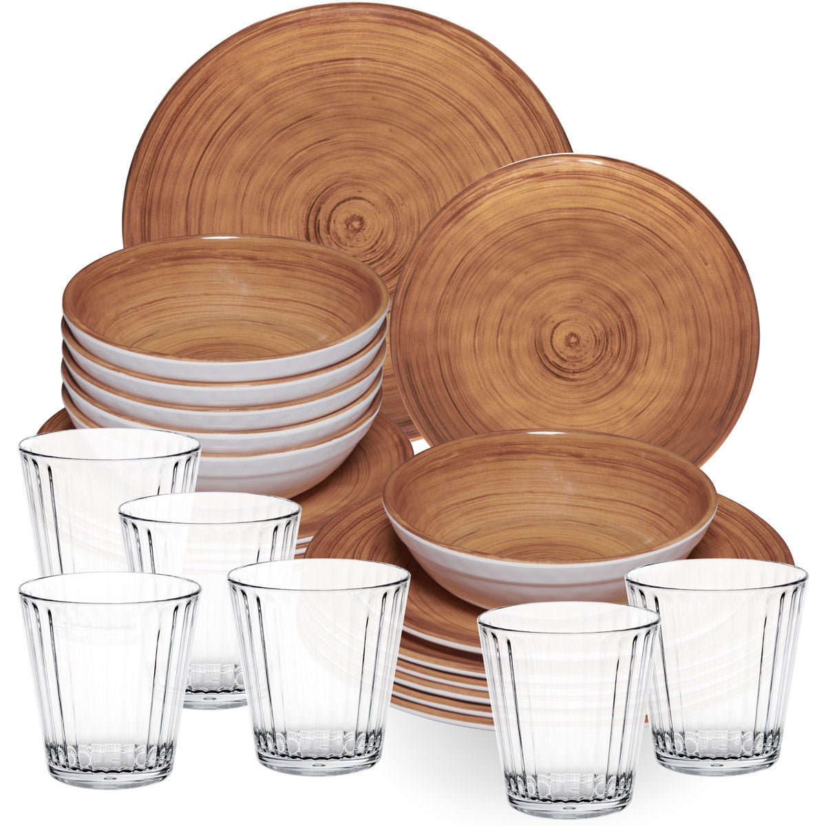 Melamin Geschirr Set Bambi Braun für 6 Personen - 24 Teile mit klaren Trinkgläsern 360 ml aus Acryl Steingutoptik Campinggeschirr