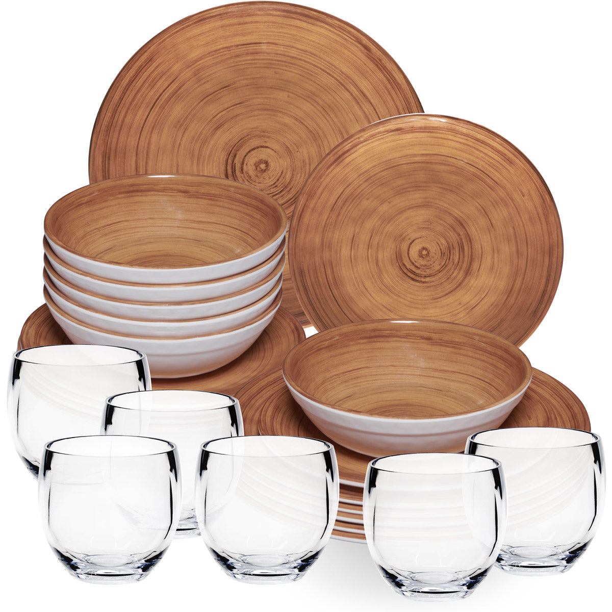 Melamin Geschirr Set Bambi Braun für 6 Personen - 24 Teile mit klaren Trinkgläsern 400 ml aus Acryl Steingutoptik Campinggeschirr