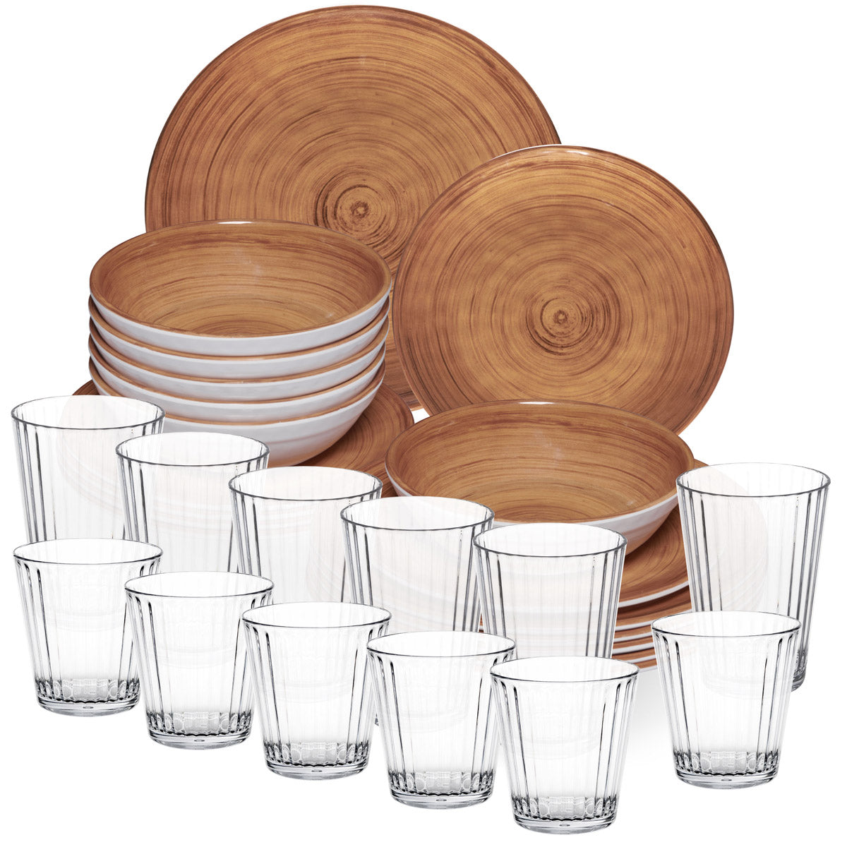 Melamin Geschirr Set Bambi Braun für 6 Personen - 30 Teile mit klaren Trinkgläsern 360+580 ml aus Acryl Steingutoptik Campinggeschirr
