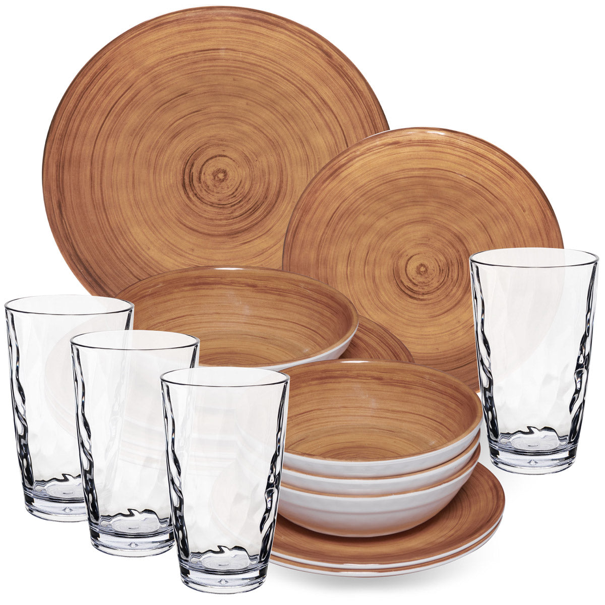 MELAMIN GESCHIRRSET 16 TEILE FÜR 4 PERSONEN MIT ACRYL TRINKGLÄSERN 460ML IN KLAR: Bambi Braun - Holz-Optik in Brauntönen auf weißem Grundmaterial - Oberfläche uneben und wellig - ideal für Camping,...