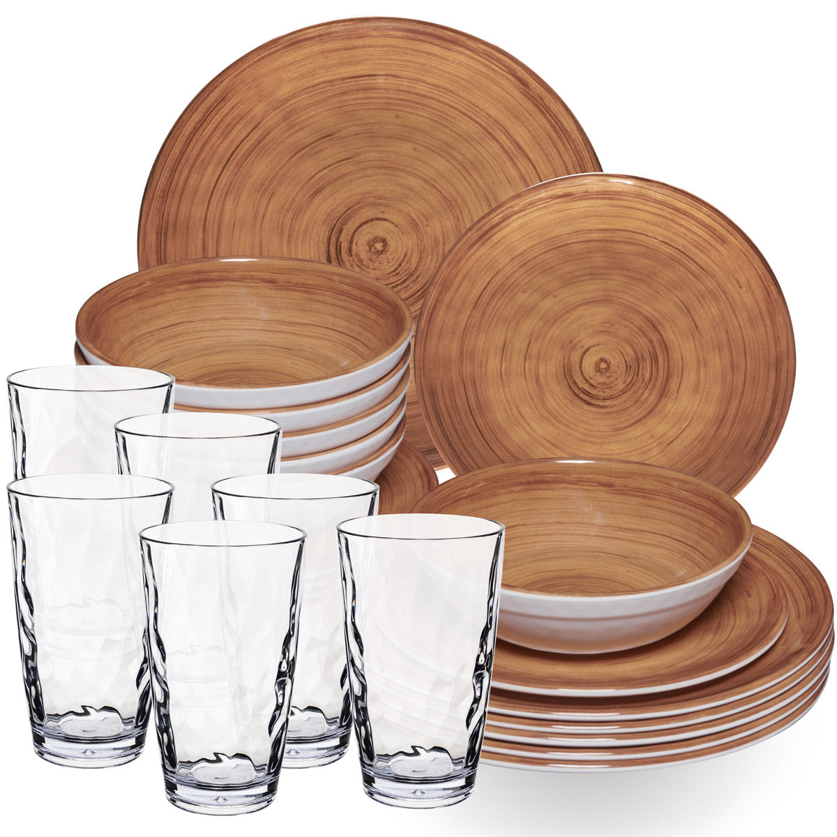 Melamin Geschirr Set Bambi Braun für 6 Personen - 24 Teile mit klaren Trinkgläsern 460 ml aus Acryl Steingutoptik Campinggeschirr