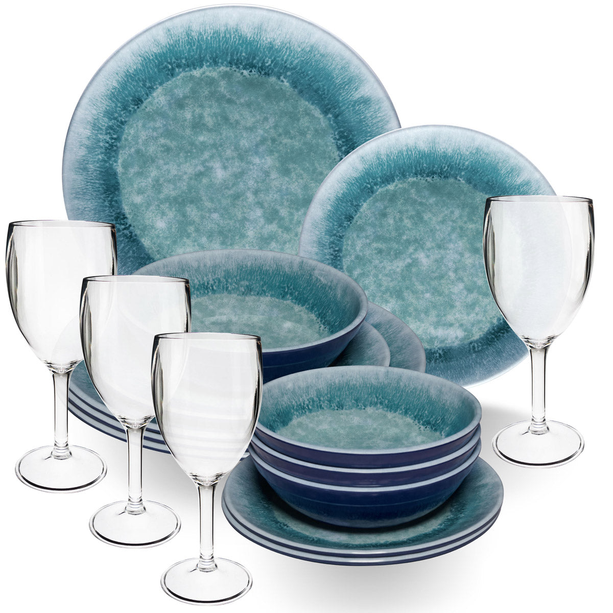 Melamin Geschirr Set Adria Blue für 4 Personen - 16 Teile Blau - klaren Weingläsern aus Acryl Steingutoptik Campinggeschirr