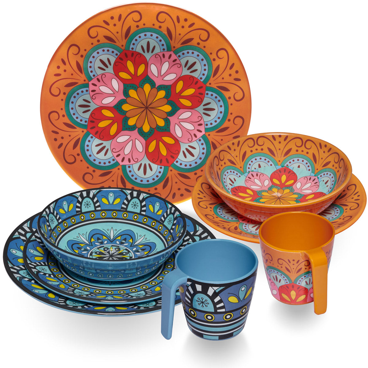 Melamin Geschirr Set Toskana Pastel für 2 Personen - 8 Teile - Orange-Blau - Mandala-Optik Essgeschirr Campinggeschirr