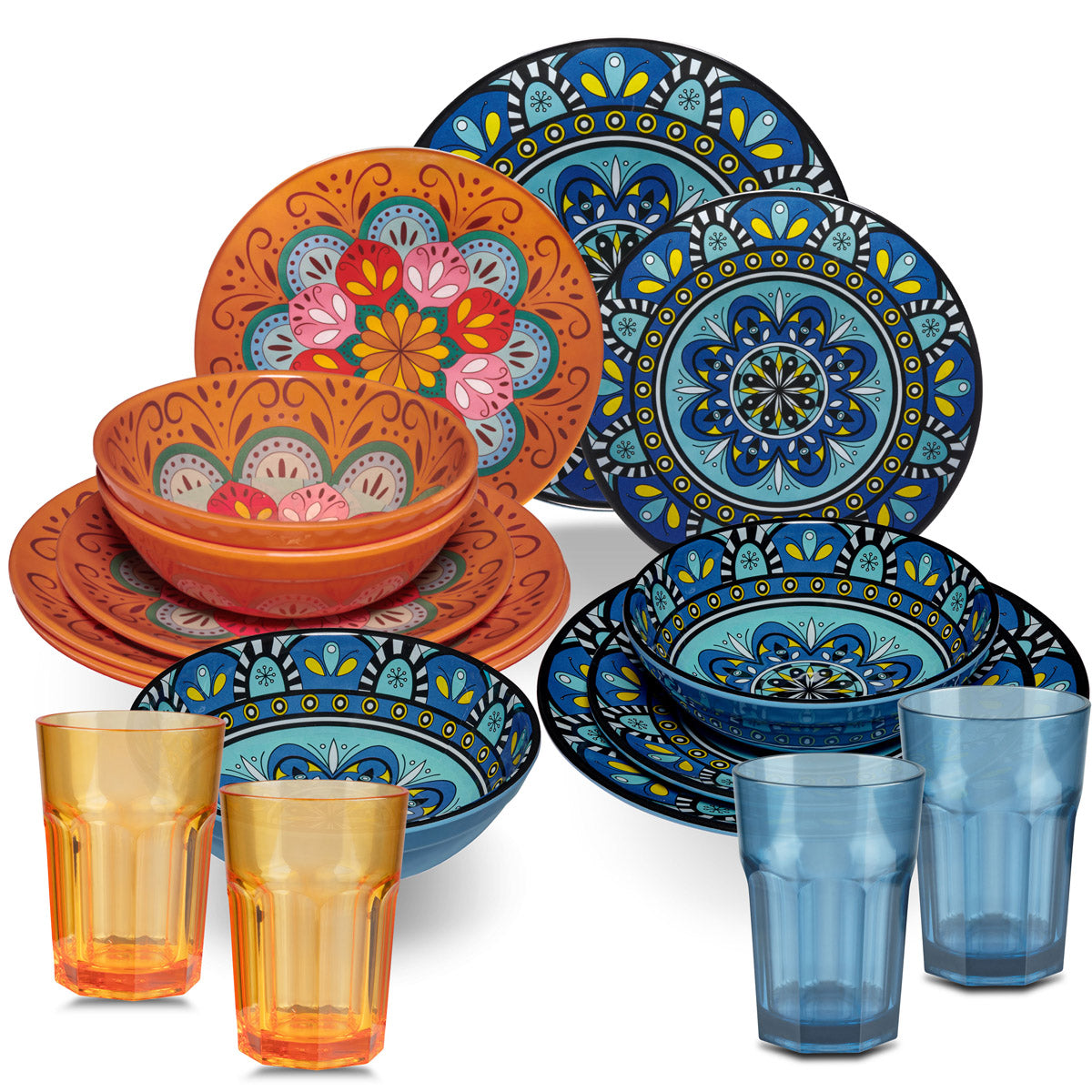 Melamin Geschirr Set Toskana Pastel für 4 Personen - 16 Teile - Orange-Blau - Mandala-Optik mit farblich passenden Trinkgläsern 400 ml aus Acryl Campinggeschirr