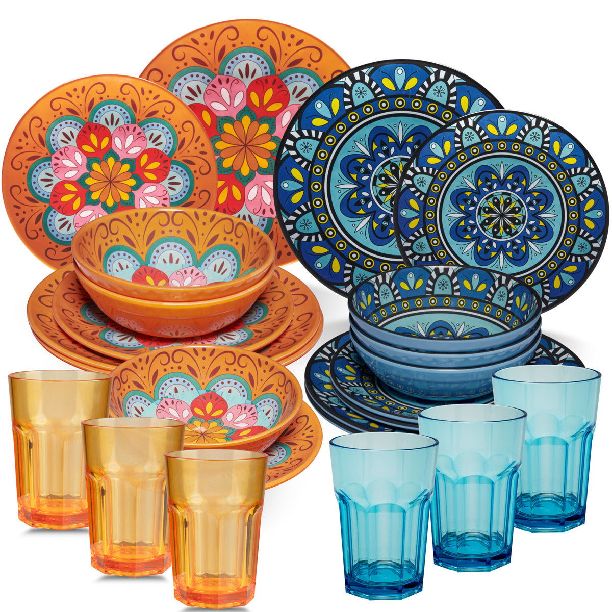 Melamin Geschirr Set Toskana Pastel für 6 Personen - 24 Teile - Orange-Blau - Mandala-Optik mit farblich passenden Trinkgläsern 400 ml aus Acryl Spülmaschinengeeignet Campinggeschirr