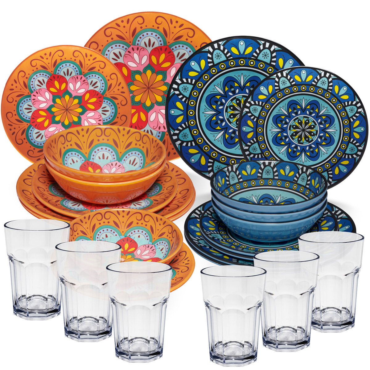 Melamin Geschirr Set Toskana Pastel für 6 Personen - 24 Teile - Orange-Blau - Mandala-Optik mit klaren Trinkgläsern 400 ml aus Acryl Spülmaschinengeeignet Campinggeschirr