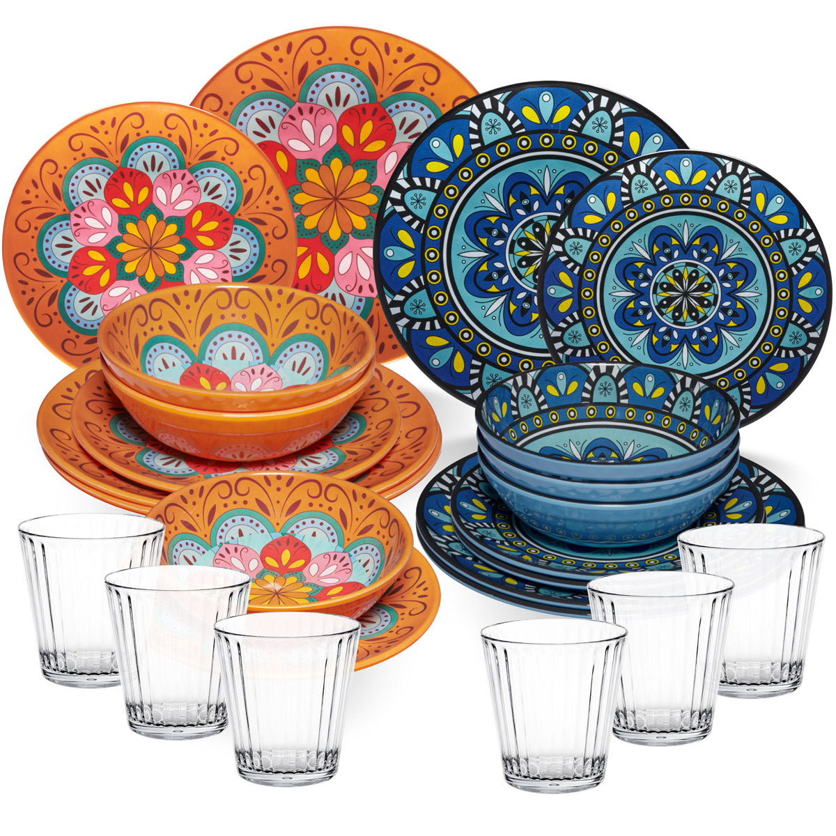 Melamin Geschirr Set Toskana Pastel für 6 Personen - 24 Teile - Orange-Blau - Mandala-Optik mit klaren Trinkgläsern 360 ml aus Acryl Spülmaschinengeeignet Campinggeschirr