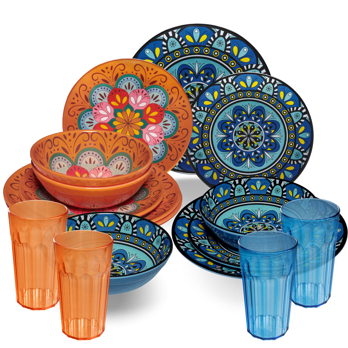 Melamin Geschirr Set Toskana Pastel für 4 Personen - 16 Teile - Orange-Blau - Mandala-Optik mit farblich passenden Trinkgläsern 630 ml aus Acryl Campinggeschirr