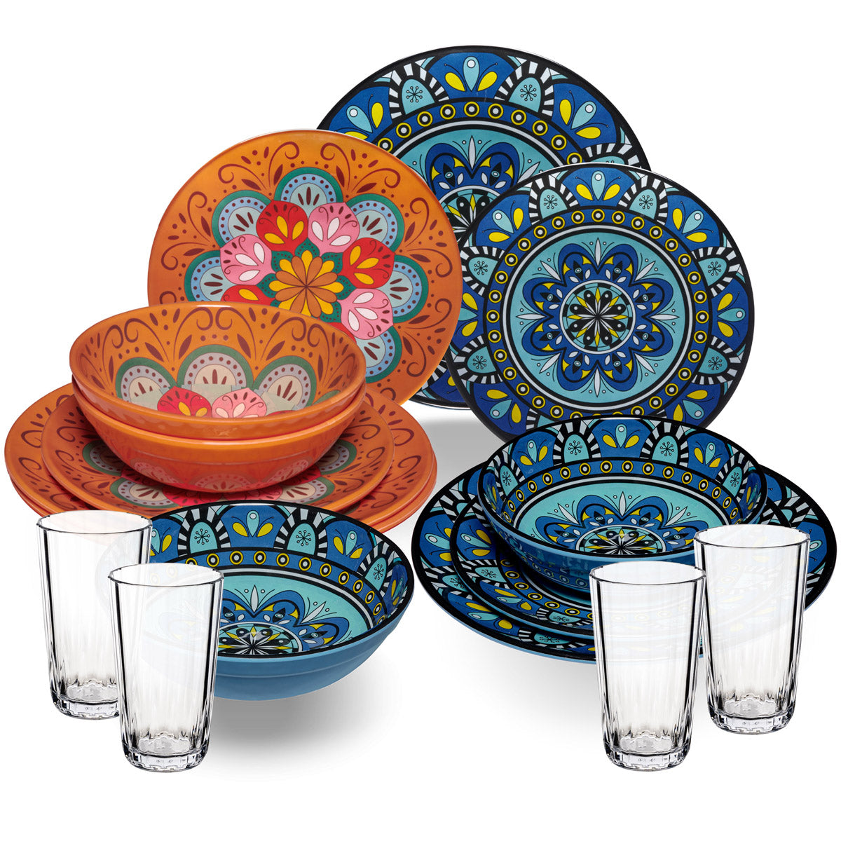 Melamin Geschirr Set Toskana Pastel für 4 Personen - 16 Teile - Orange-Blau - Mandala-Optik mit klaren Trinkgläsern 300 ml aus Acryl Campinggeschirr