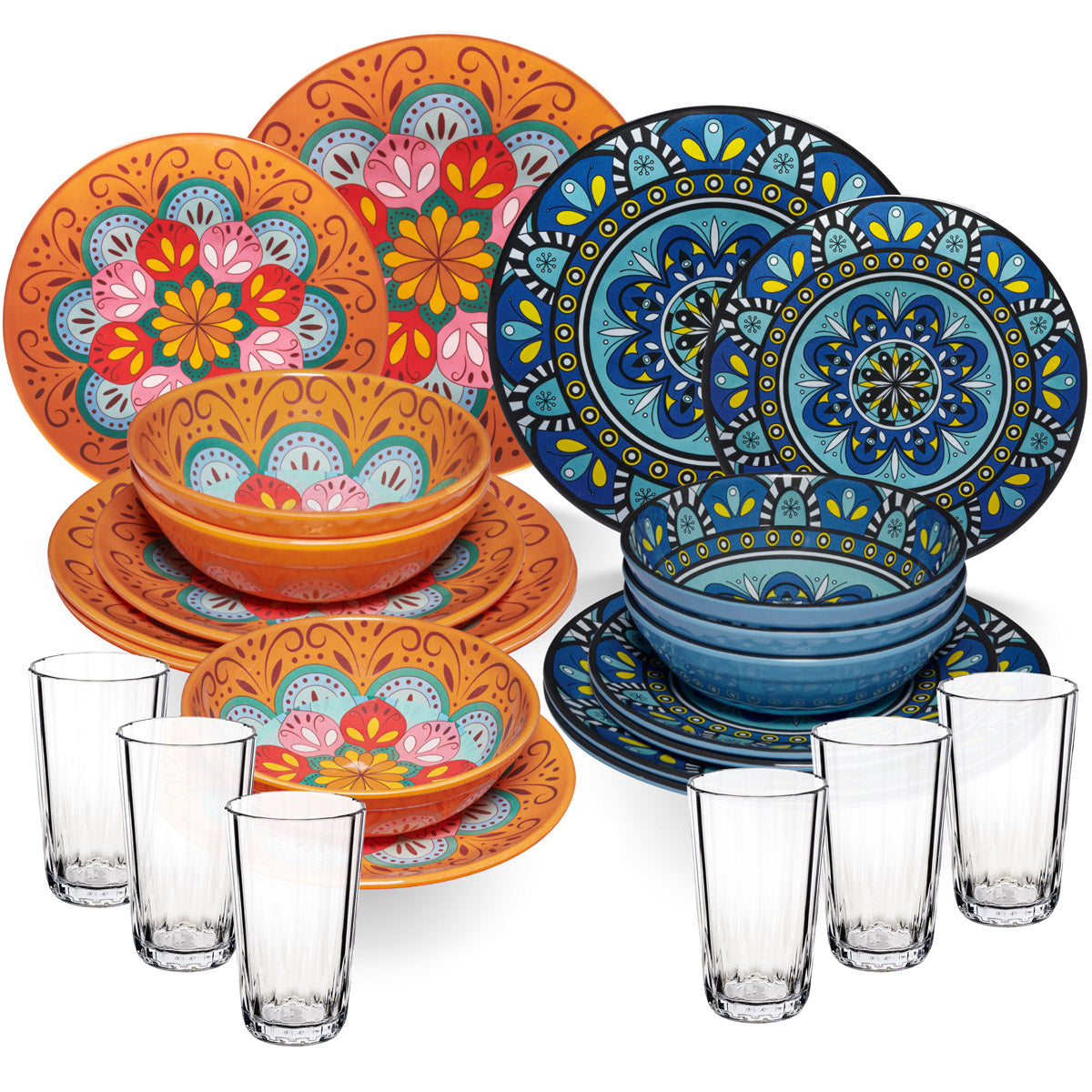 Melamin Geschirr Set Toskana Pastel für 6 Personen - 24 Teile - Orange-Blau - Mandala-Optik mit klaren Trinkgläsern 300 ml aus Acryl Spülmaschinengeeignet Campinggeschirr